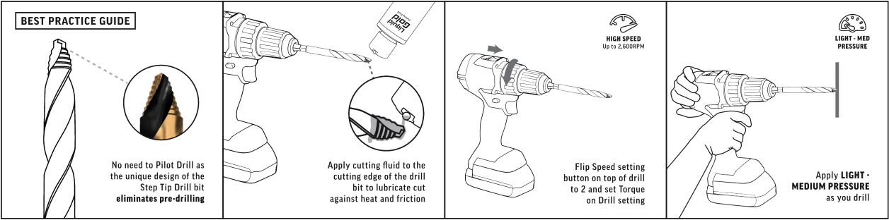 To get the best bang for your buck when drilling into ≤3mm Mild Steel Flat Bar using an ONSITE+ Step Tip Drill bit sizes ranging 3.0 – 5.0mm, the Alpha recommendation is using a Cordless Drill/Driver.