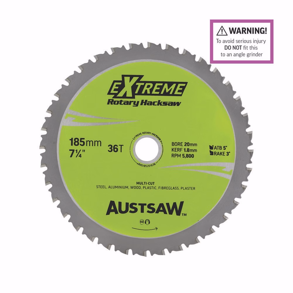 The Austsaw Rotary Hacksaw cutting blade is made with a hardened tempered body for clean, smooth cuts (fast and smooth cutting action). Titanium carbide teeth provide longer life when metal cutting, and a high-raised shoulder provides maximum strength behind each tip. Purchase the Austsaw Rotary Hacksaw circular saw blade and you will experience extreme cutting performance!