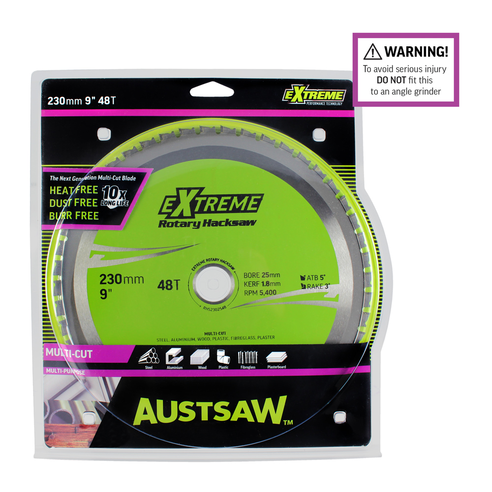 The Austsaw Rotary Hacksaw cutting blade is made with a hardened tempered body for clean, smooth cuts (fast and smooth cutting action). Titanium carbide teeth provide longer life when metal cutting, and a high-raised shoulder provides maximum strength behind each tip. Purchase the Austsaw Rotary Hacksaw circular saw blade and you will experience extreme cutting performance!