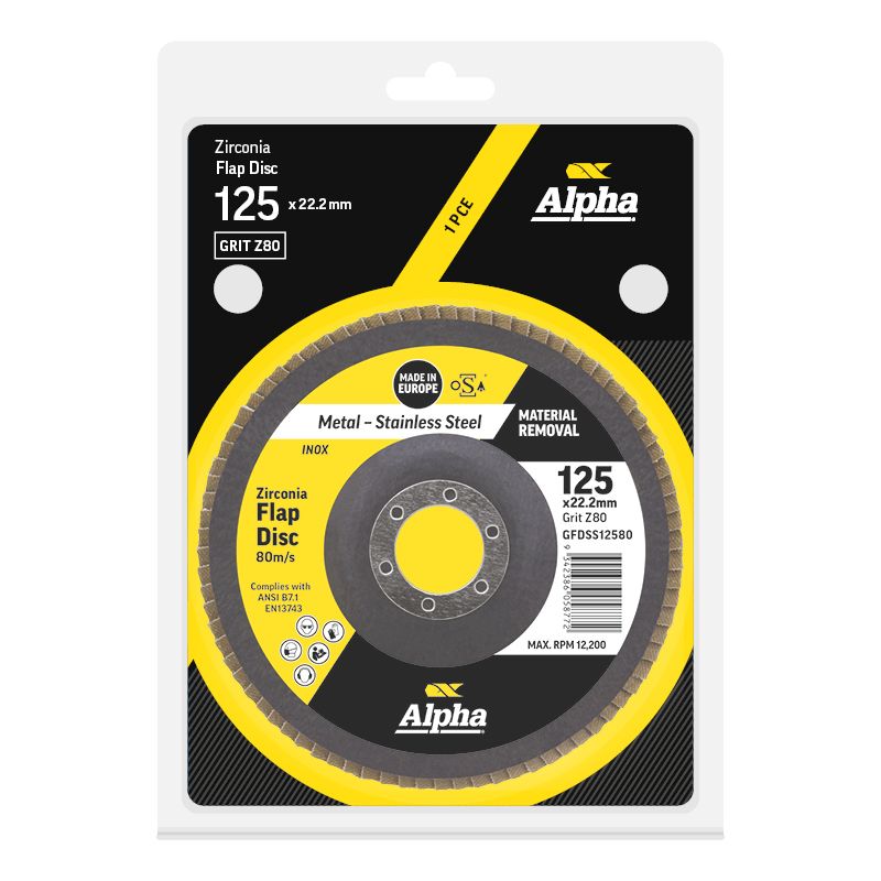 Alpha Flap Discs are premium quality discs made in Germany using quality Zirconia abrasive material, to produce the ultimate performer in mild steel and stainless steel grinding and finishing applications